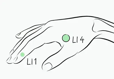 • Open your thumb and index finger: you’ll see a fleshy peak in the web area — LI4 is in that region.